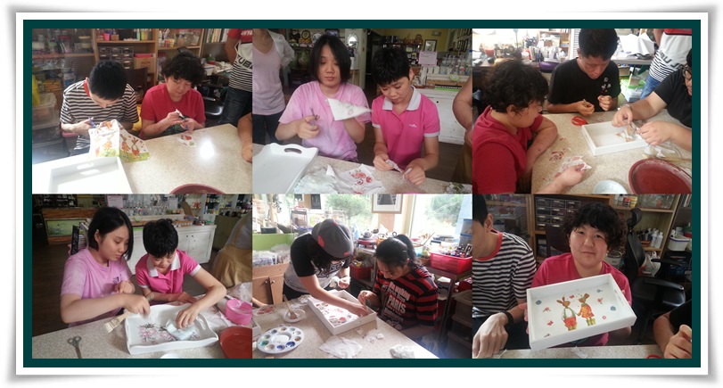 냅킨을 오리고 붙이고 칠을 하다보니 어느새 예쁜 쟁반을 완성되었답니다