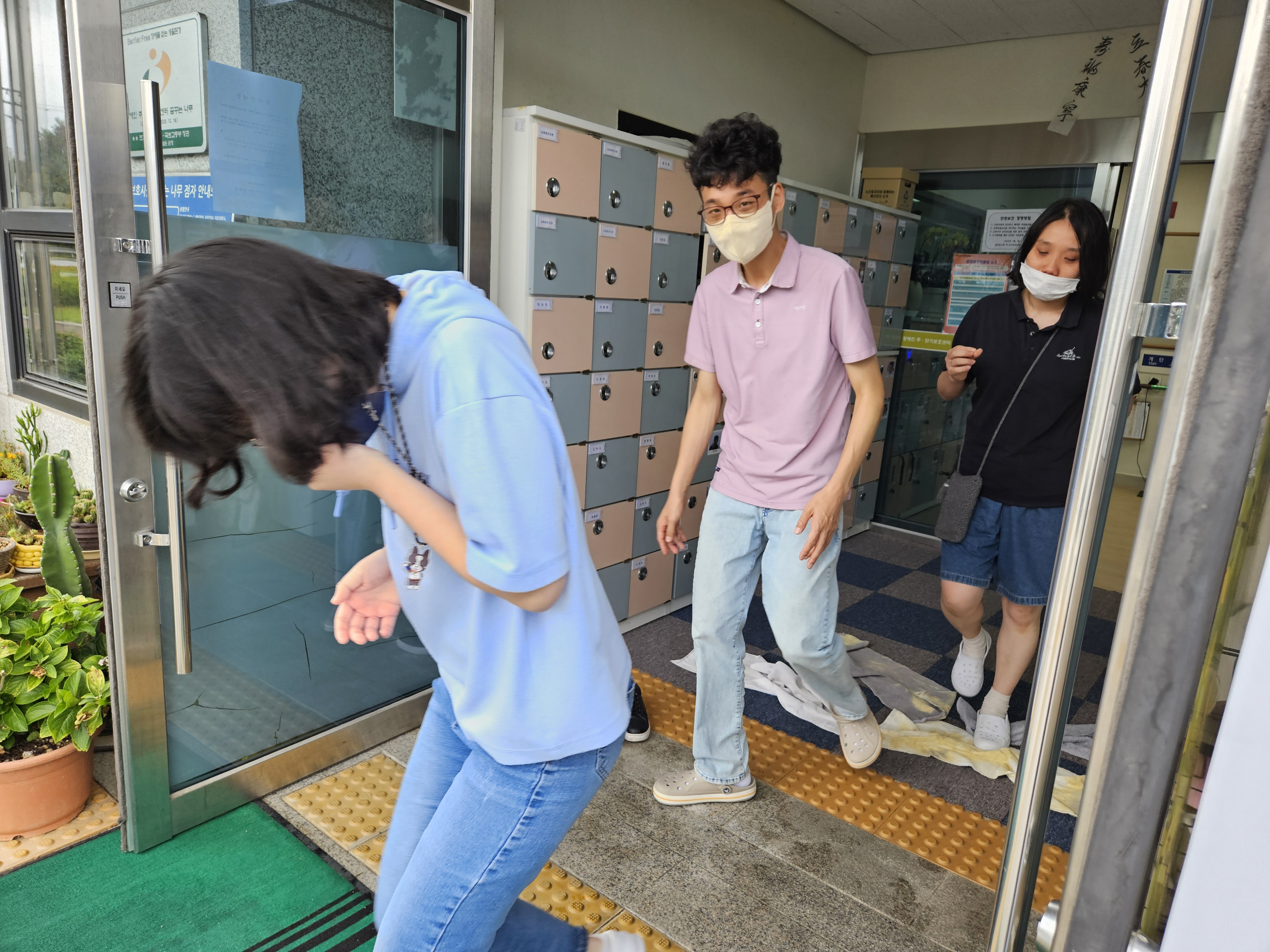 서둘러 몸을 숙이고 코와 입을 막고 현관으로 대피하였답니다.