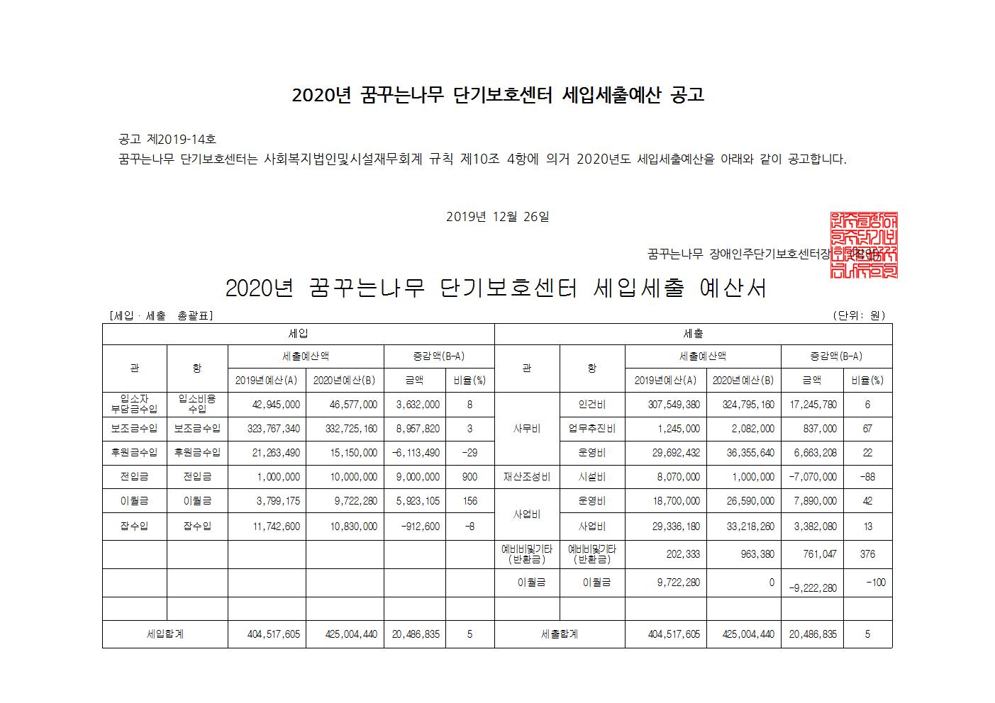 2020년 꿈꾸는나무 단기보호센터 세입세출 예산 공고