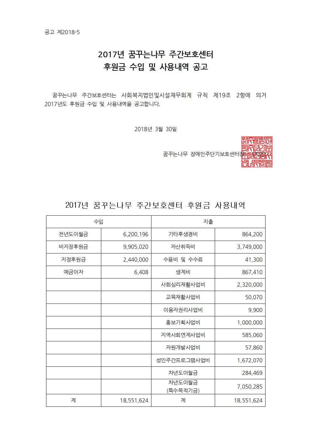 [공고]2017년 꿈꾸는나무 주간보호센터 후원금사용내역 공고