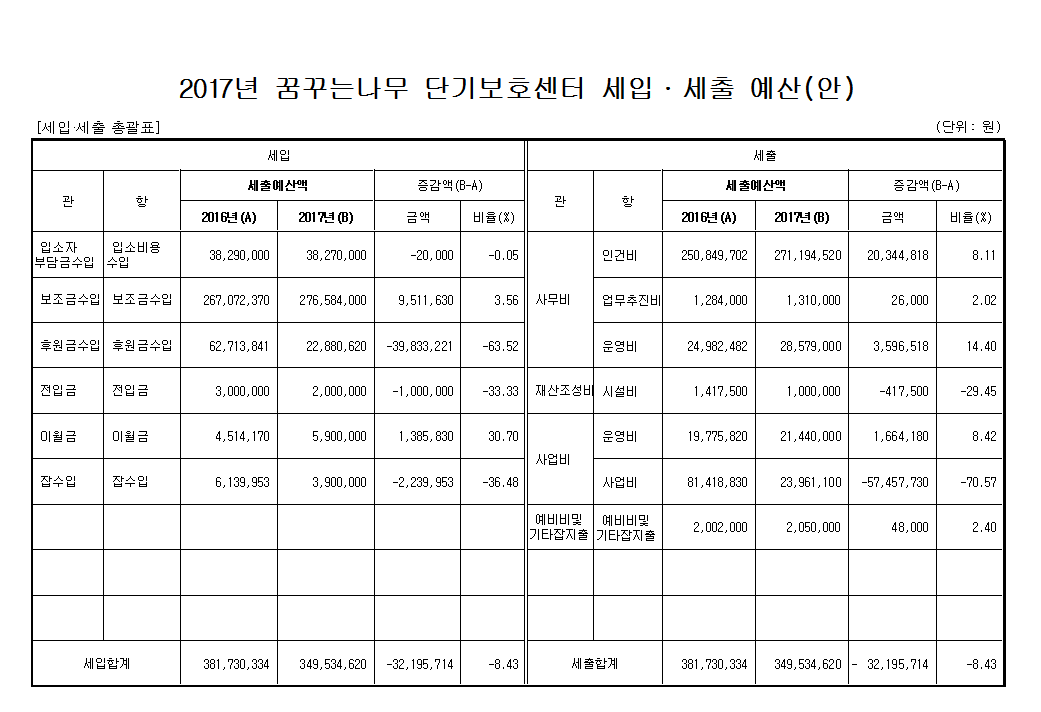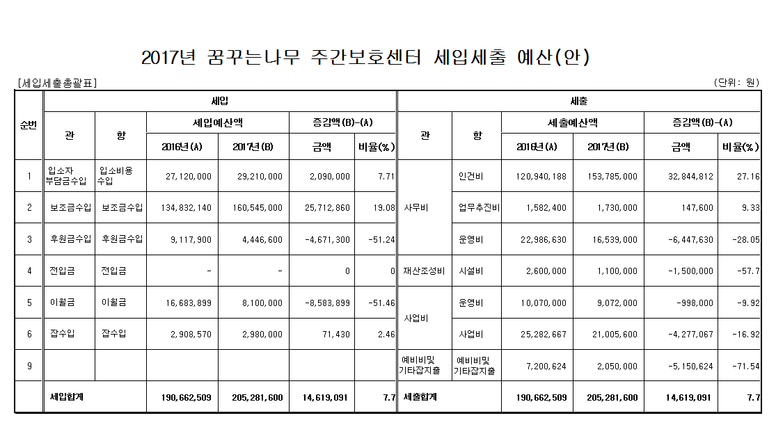 상기와 같이 2017년 꿈꾸는나무 세입세출 예산을 공고합니다.