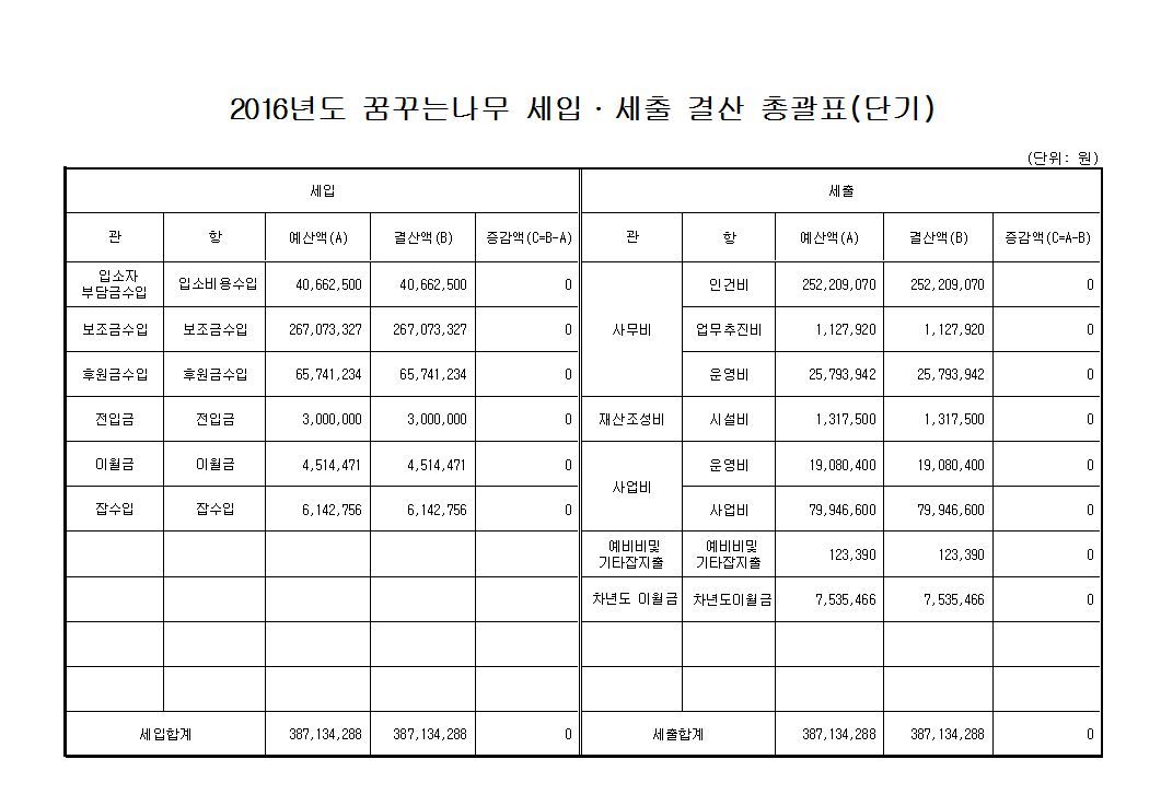 상기와 같이 2016년 꿈꾸는나무 세입세출 결산내역을 공고합니다.