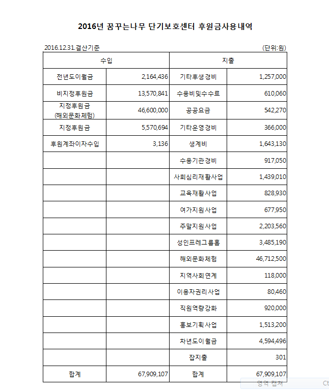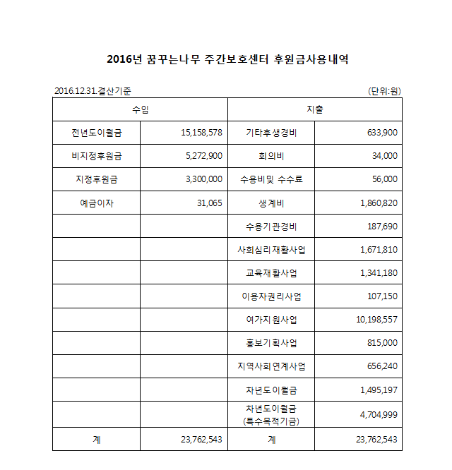 2016년 꿈꾸는나무 후원금수입및사용내역 공고