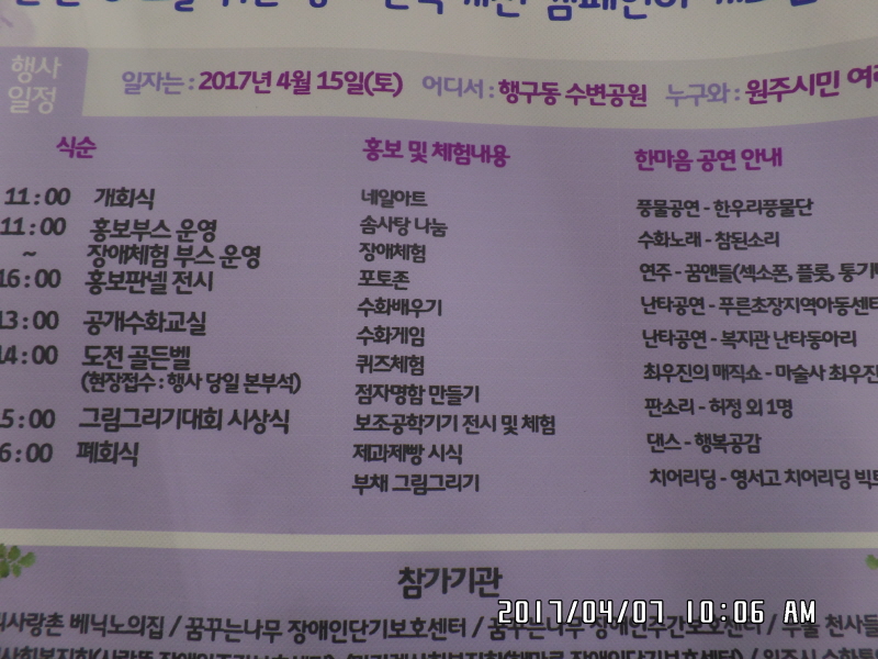 2017년 장애인식개선 캠페인이 2017년 4월 15일(토) 행구동 수변공원에서 개최됩니다.