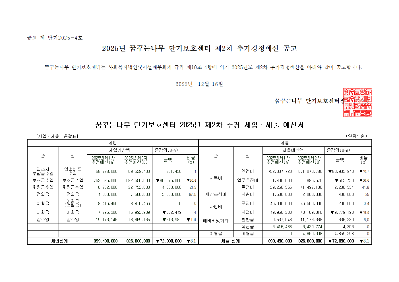 꿈꾸는나무 단기보호센터 2025년 제2차 추가경정예산 공고