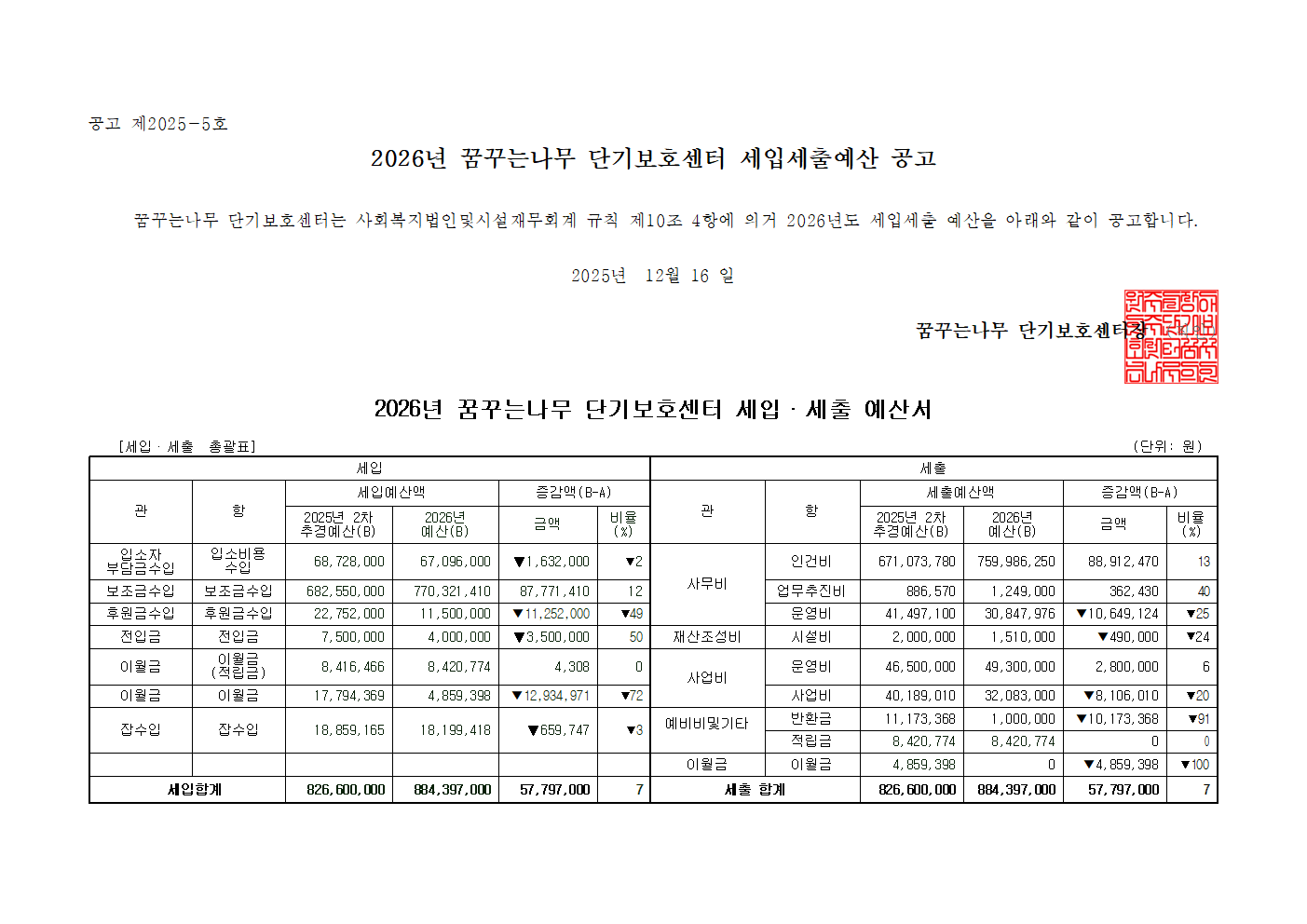 꿈꾸는나무 단기보호센터 2026년 세입세출 예산공고
