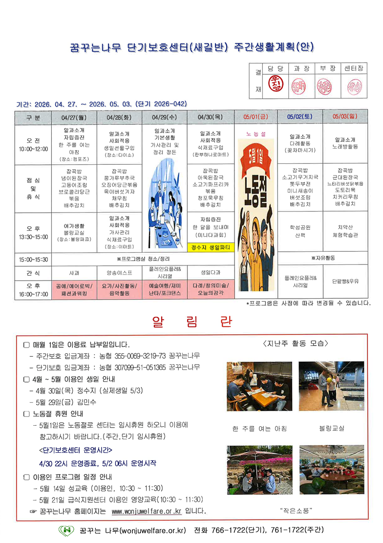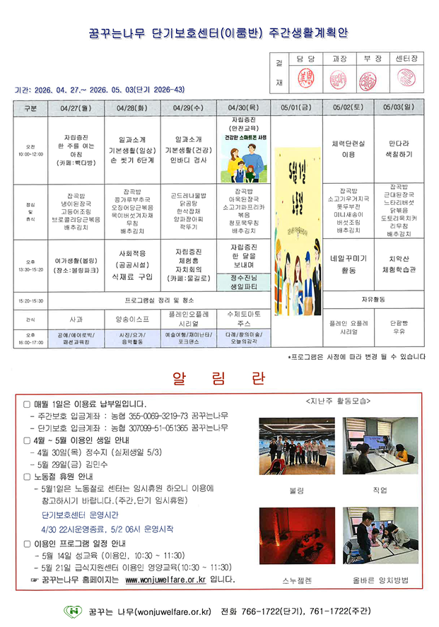 이룸반, 새길반 주간계획안(2026.04.27~05.01)