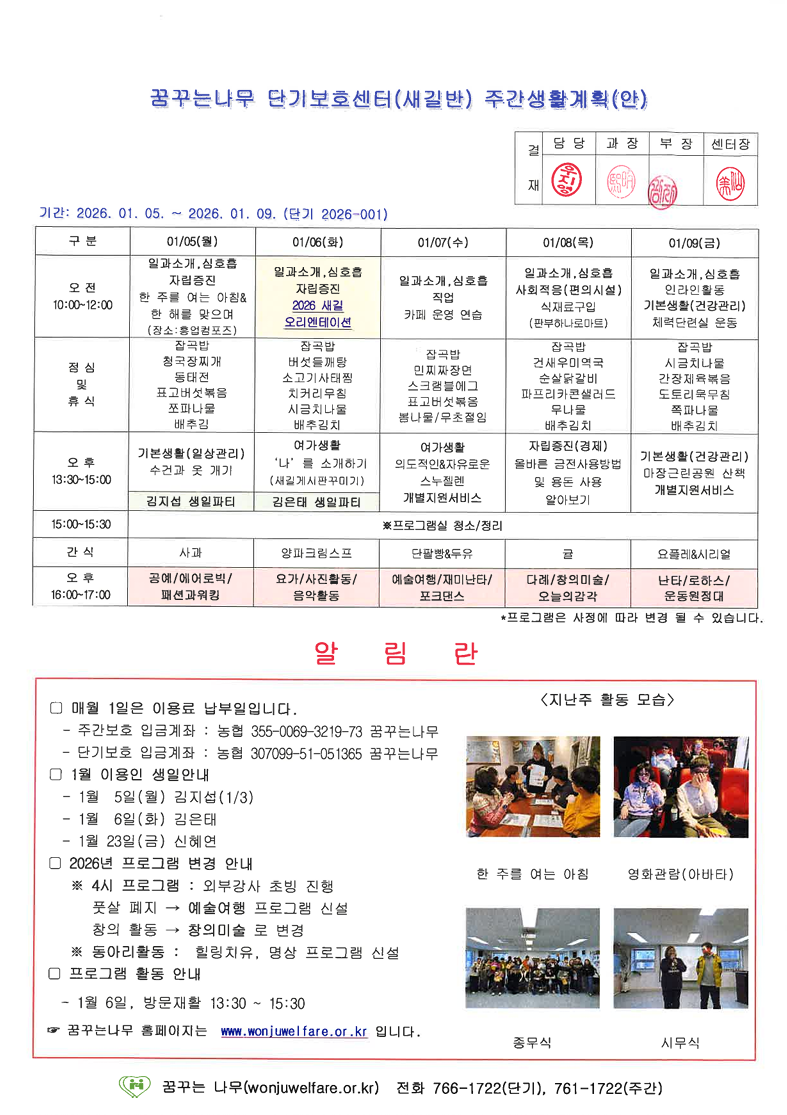 이룸반, 새길반 주간계획안(2026.01.05~2026.01.09)