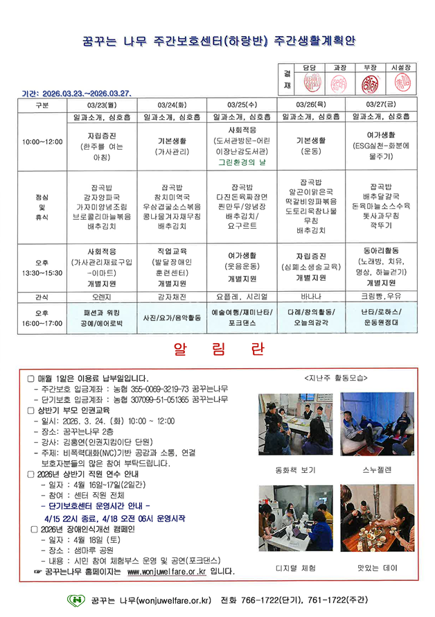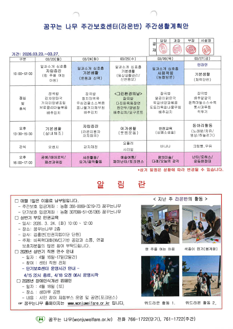 찬솔반, 하랑반, 윤슬반, 라온반 주간계획안(2026.03.23~03.27)