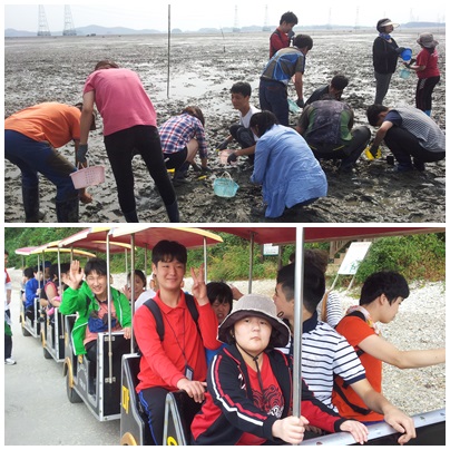 9월 주말여행으로 갯벌체험~~ 멀리 보이는 수평선과 맞닿은 바다 도착 하자 점심으로 조개가 듬뿍 들어간 칼국수와 달콤한 제부도포도를 맛있게 먹은 후 드디어 기다리던 조개 잡으로 갯벌 속으로~~ 우리친구들은 장화신고 각자 호미 들고 바다길을 걸어며 살아있는 조개와 빠르게 지나가는 꽃게를 잡으며, 평소에는 들어가지 말라던 흙탕물도 재미는 놀이감이 되어 친구들 얼굴에 흙을 묻히며 선생님 얼굴에도 그림을 그리며 깔깔 웃으며 신나는 하루를 보냈답니다.