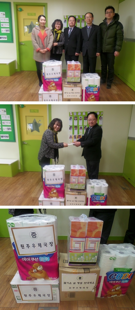 2월 4일 단구동에 위치한 원주우체국에서 국장님과 직원분들이 사랑뜰을 찾아오셨어요. 다양한 생필품으로 두 손을 무겁게 하시고 말이죠~ 약소하다고 작고 말씀을 하셨지만 저희에게는 큰 힘이 된답니다. 누군가에게서 관심을 받는 다는 것, 지역사회 안에서 함께 살아가고 있다는 것, 여러사람들의 응원 받고 있다는 것, 이러한 것들은 값으로 환산할 수가 없다고 생각합니다. 그런데 어떻게 약소할 수가 있겠습니까? 언제라도 찾아와 주세요. ^^