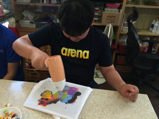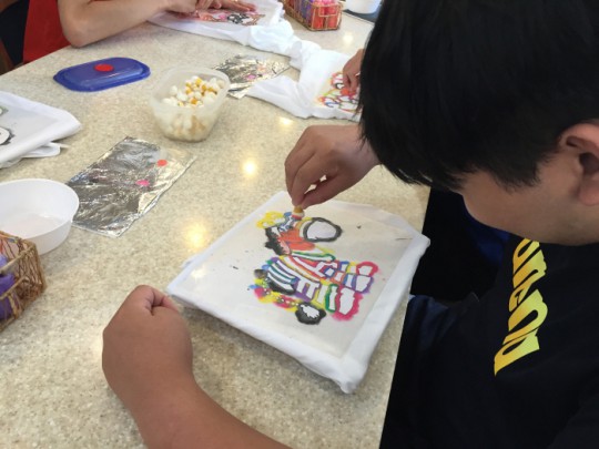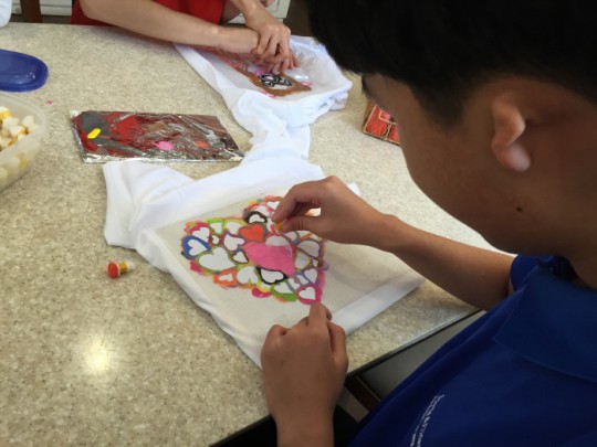 면티셔츠위에 예쁜 도안을 놓고 따뜻하고 부드러운 형형색색의 물감을 두드려서