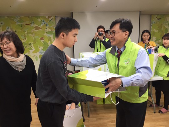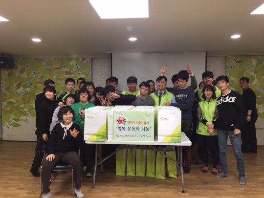 친구들 한사람 한사람과 눈을 맞추고 운동화를 전달하면서