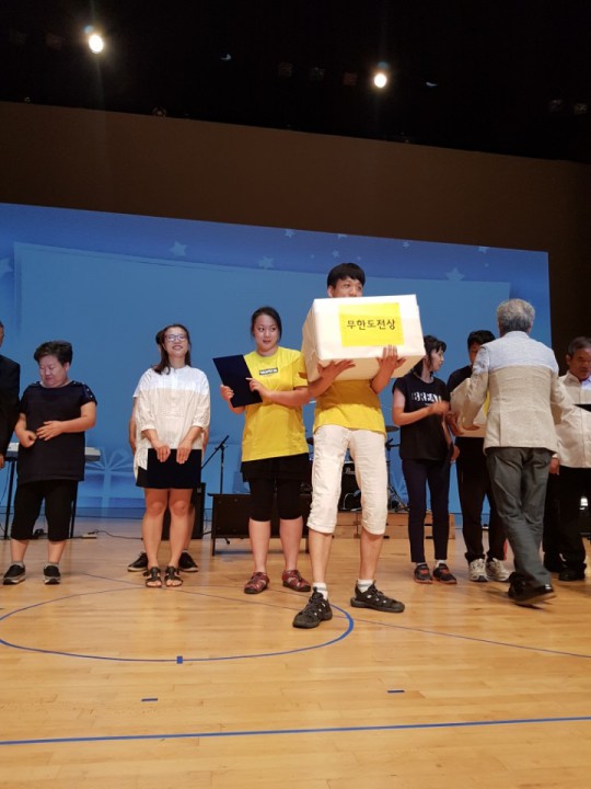 제5회 원주시 장애인복지시설 종합예술제가 6월23일 백운아트홀에서 진행되었습니다. 11개 장애인복지시설을 이용하시는 이용인분들과 관계자분들이 참가해 주시어 흥겹고 즐거운 화합의 한마당을 이루었습니다. 저희 센터에서는 이용인분들이 멋진 댄스를 선보임에 따라 "무한도전상"을 받는 쾌거를 이룩했습니다. 축하합니다~~~~~ 예술제를 짬짬이 준비하느라 노력해 주신 참가 이용인분들과 선생님들 수고하셨습니다..