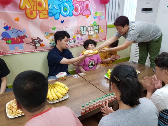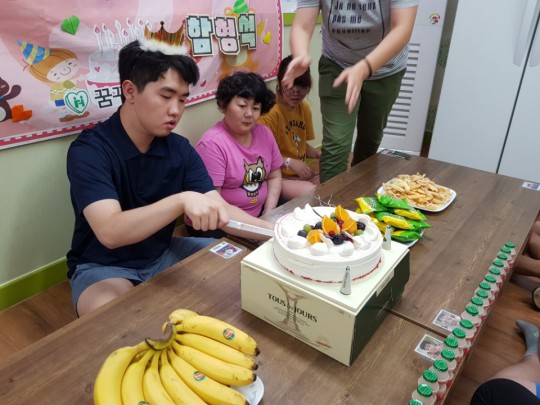 함형석군의 생일파티가 오늘 진행되었습니다. 동료이용인들로부터 축하를 받으며 매우 즐거워 하였습니다. 케익을 자르는 형석군의 모습이 사뭇 진지해 보이네요 ^^ 형석씨~ 생일축하해요~ 멋진 청년의 모습을 기대해 볼께요~