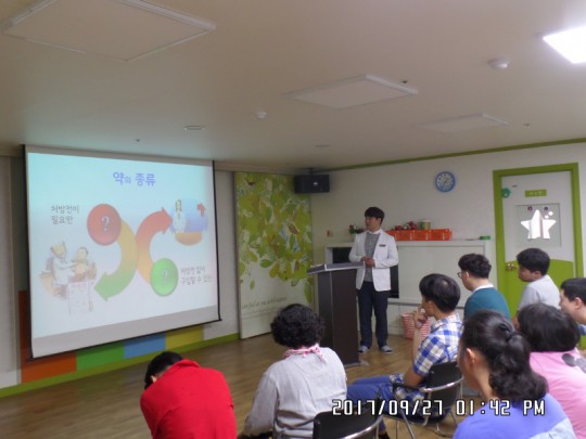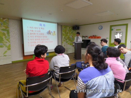 2017년 하반기 이용자 약물교육이 원주시약사회와 연계하여 진행되었습니다. 약물 오남용에 따른 안전사고를 예방하고 약물의 특성을 바로 알고 올바르게 사용해야 되는 것을 알 수 있었습니다.. 좋은 교육을 받을 수 있도록 힘써주신 원주시 약사회 간사님, 원주시 약사회 엄일훈 약사님께 진심으로 감사드립니다...