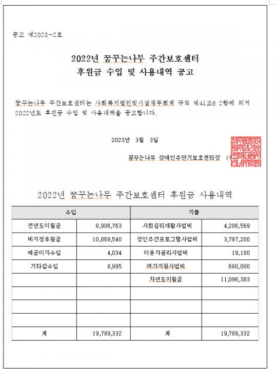 2022년 꿈꾸는나무 주간보호센터 후원금 수입 및 사용내역 공고