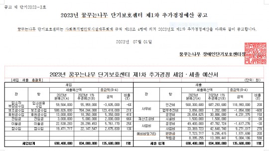 꿈꾸는나무 단기보호센터 2023년 제1차 추가경정예산 공고