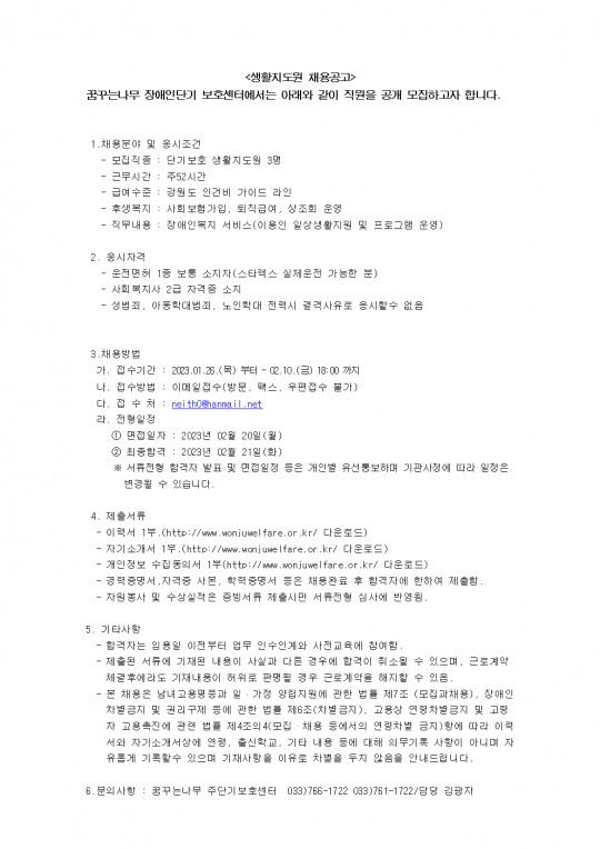 2023년 꿈꾸는나무 단기보호센터 생활지도원 채용공고(이용인 증원에 따른 신규채용)