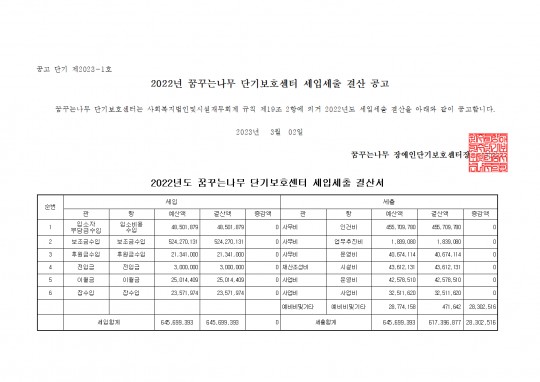 2022년 꿈꾸는나무 단기보호센터 세입세출 결산공고