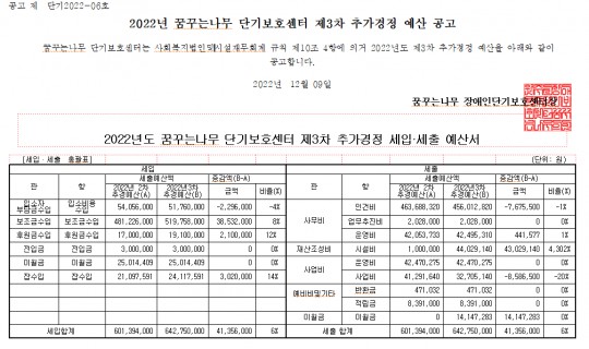 2022년 꿈꾸는나무 단기보호센터 제3차 추가경정예산 공고