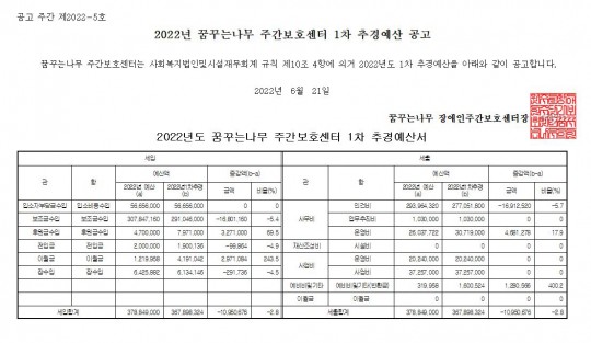 꿈꾸는나무 주간보호센터 2022년 1차 추경예산 공고