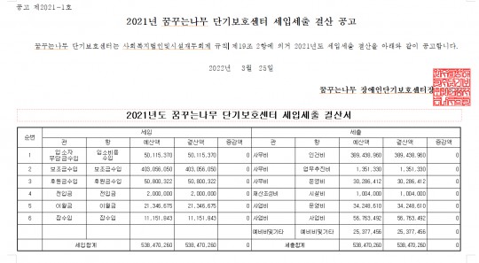 꿈꾸는나무 단기보호센터 2021년 세입세출 결산 공고