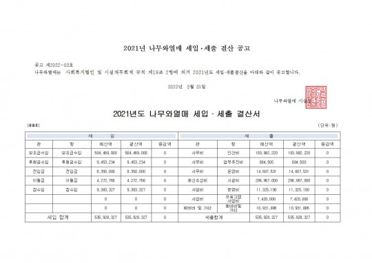 2021년 나무와열매 세입.세출 결산 공고