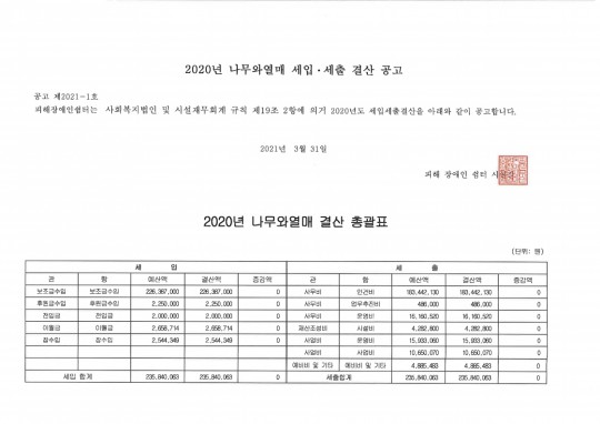 2020년 나무와열매 세입.세출 결산 공고