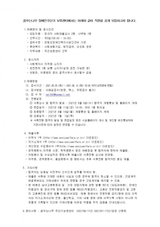2021년 꿈꾸는나무 주간보호센터 정규직 직원 채용 공고