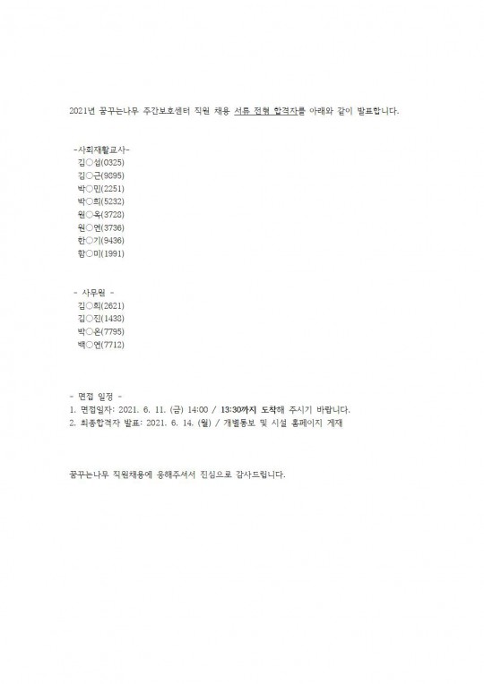 2021년 꿈꾸는나무 주간보호센터 직원 채용 서류전형 합격자 발표
