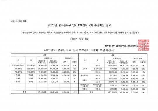 2020년 꿈꾸는나무 단기보호센터 2차 추경예산 공고
