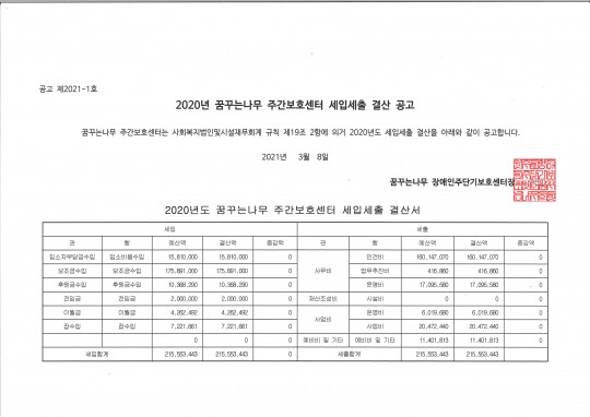 2020년 꿈꾸는나무 주간보호센터 결산 공고