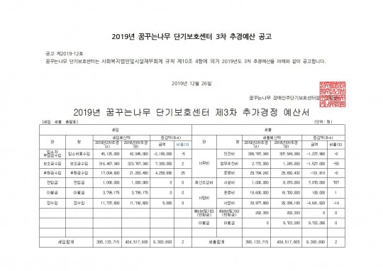 2019년 꿈꾸는나무 단기보호센터 3차 추경예산 공고