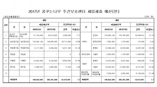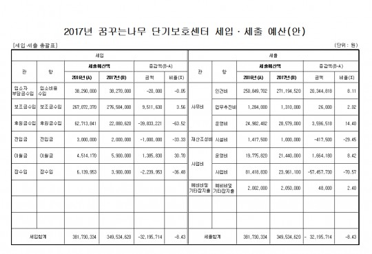 상기와 같이 2017년 꿈꾸는나무 세입세출 예산을 공고합니다.