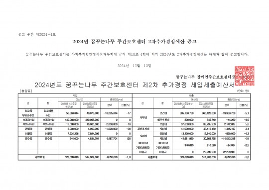 꿈꾸는 나무 주간보호센터 2024년 제2차 추가경정 예산 보고