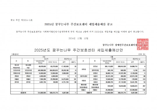 꿈꾸는 나무 주간보호센터 2025년 세입세출예산 공고