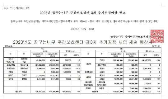 2023년 꿈꾸는나무 주간보호센터 제3차 추가경정예산 공고