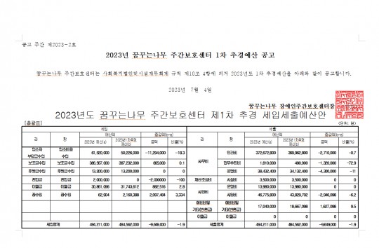 꿈꾸는나무 주간보호센터 2023년 1차 추가경정 예산공고