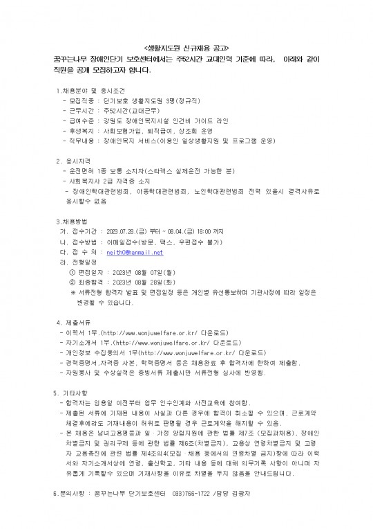 2023년 꿈꾸는나무 단기보호센터 생활지도원(3명) 채용연장 5차 재공고