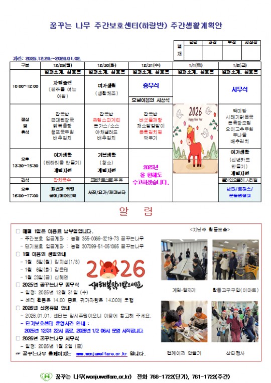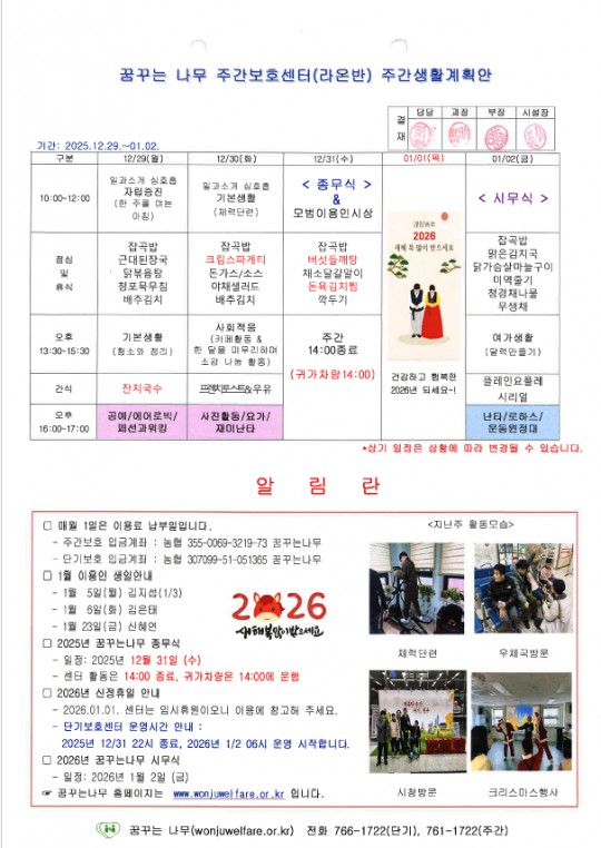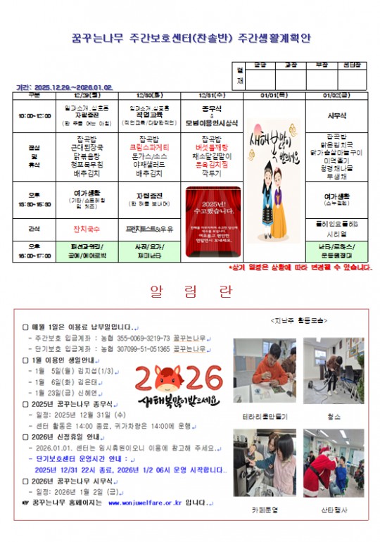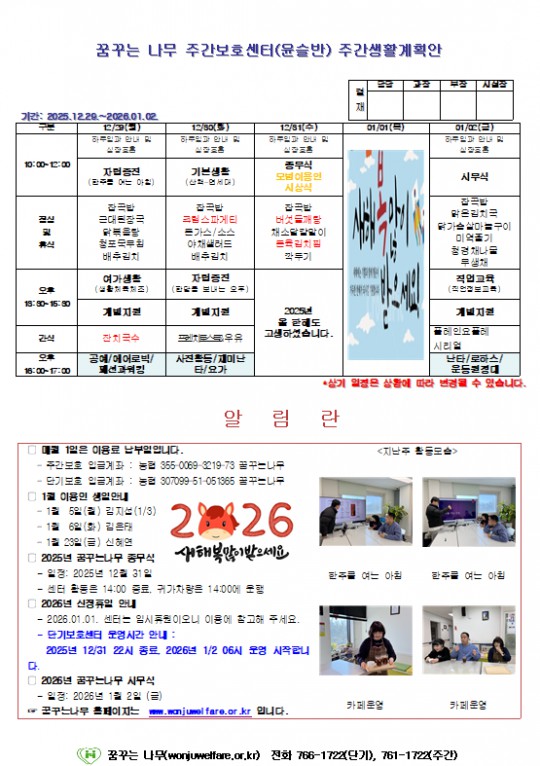 찬솔반, 하랑반, 윤슬반, 라온반 주간계획안(2025.12.29~2026.01.02)