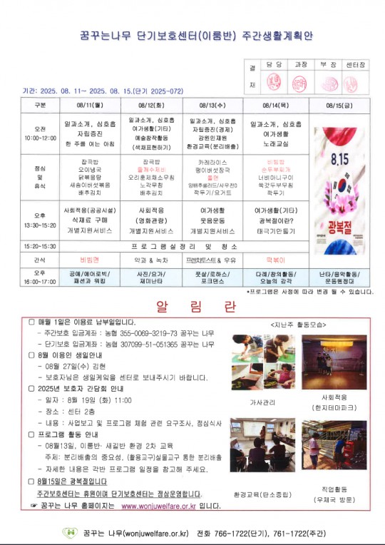 새길, 이룸 주간계획안입니다(2025.08.11~)