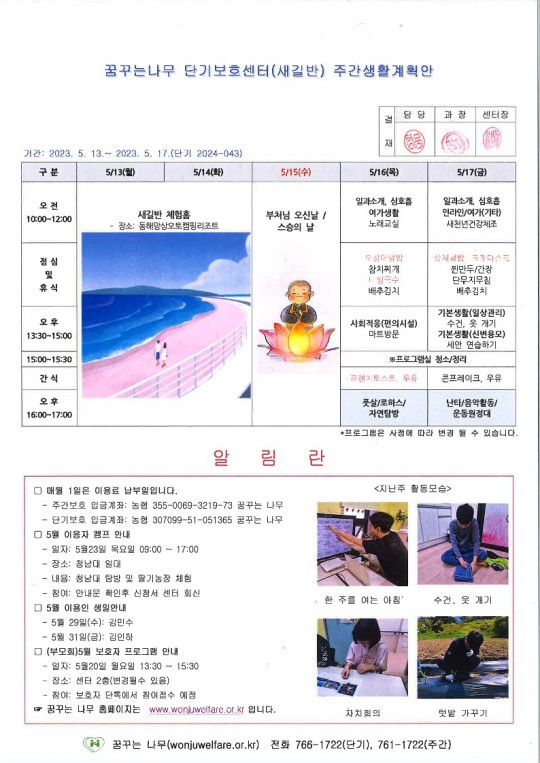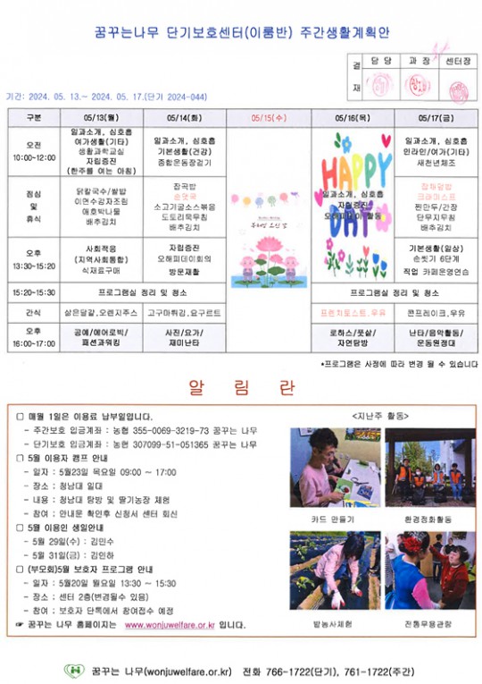 2024.05.13 ~ 05.17 단기보호 주간계획안입니다.