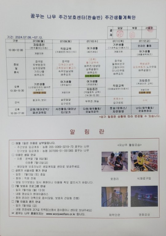 2024.07.08 ~ 2024.07.12 주간보호 주간계획안입니다.