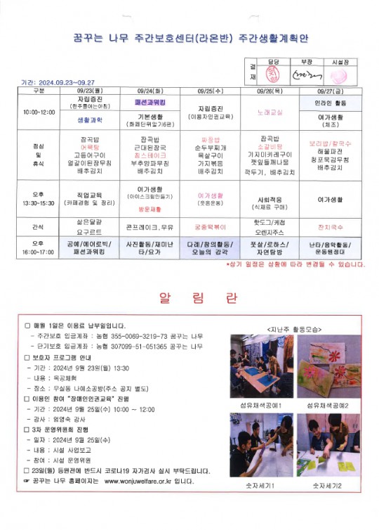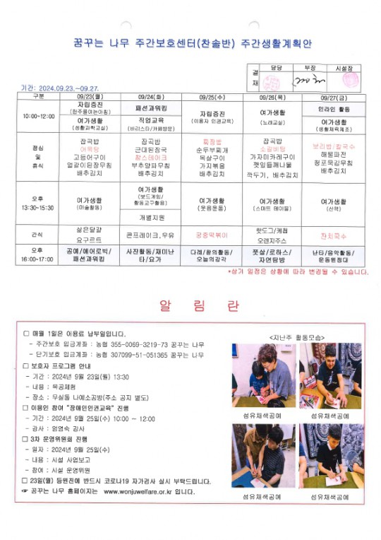 2024.09.23~2024.09.27 주간보호 주간계획안입니다.