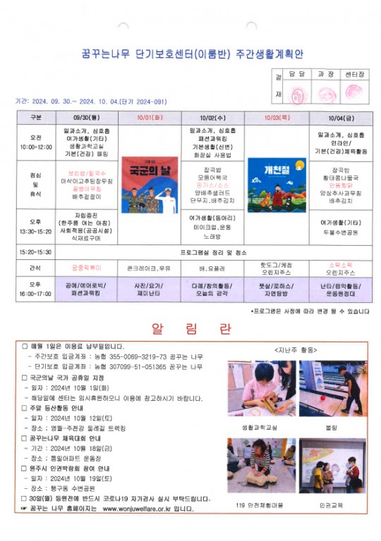 2024.09.30~10.04 단기보호 주간계획안입니다.