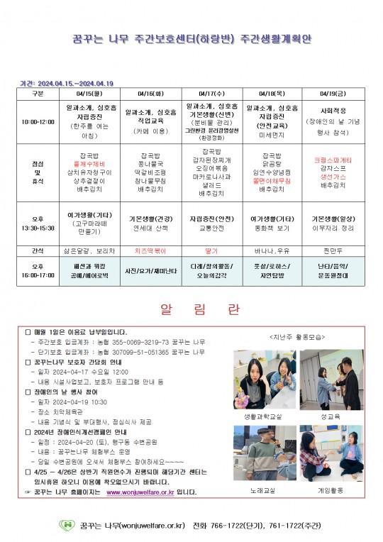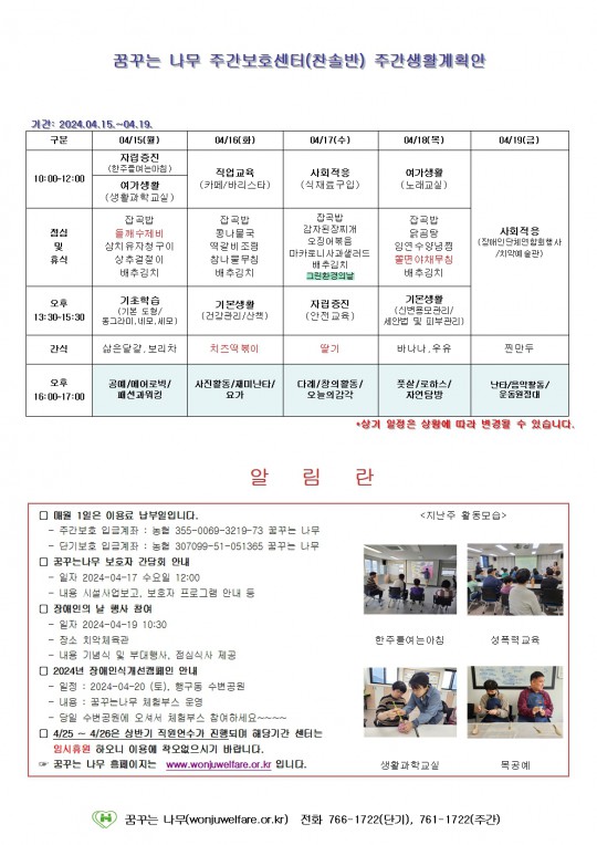 2024.04.15 ~ 04.19 주간보호 주간계획안입니다.