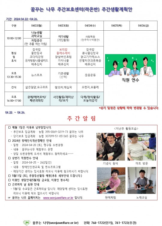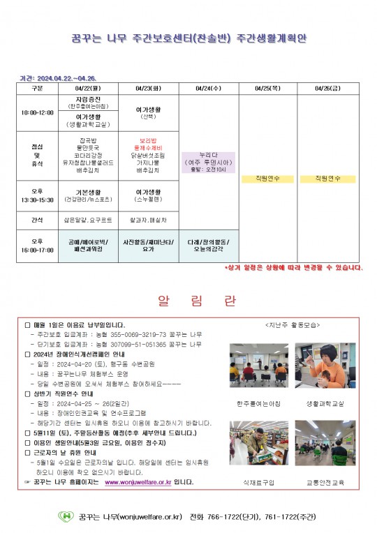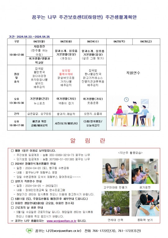 2024.04.22 ~ 2024.04.26 주간보호 주간계획안입니다.