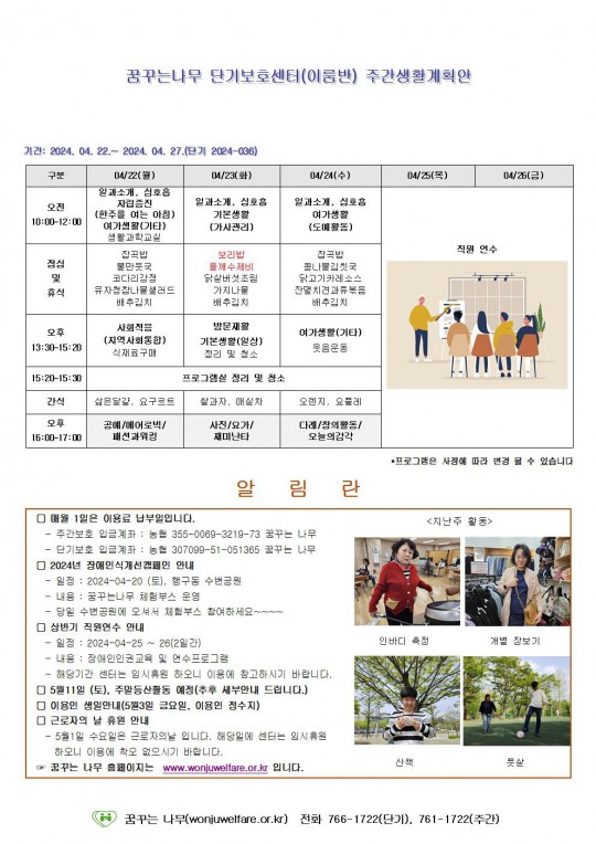 2024.04.22 ~ 2024.04.26 단기보호 주간계획안입니다.
