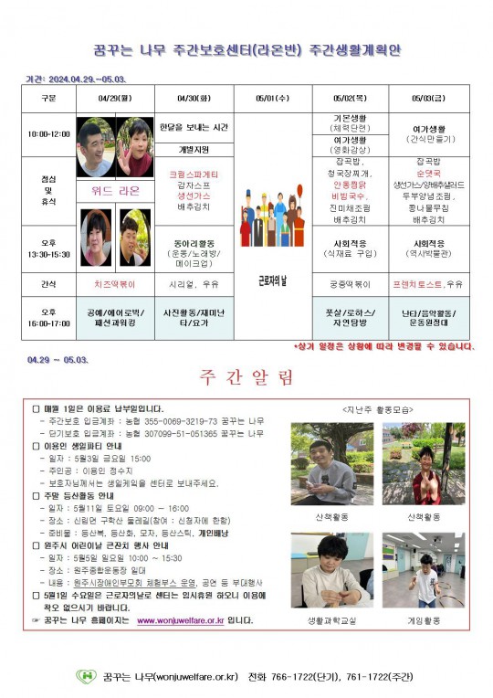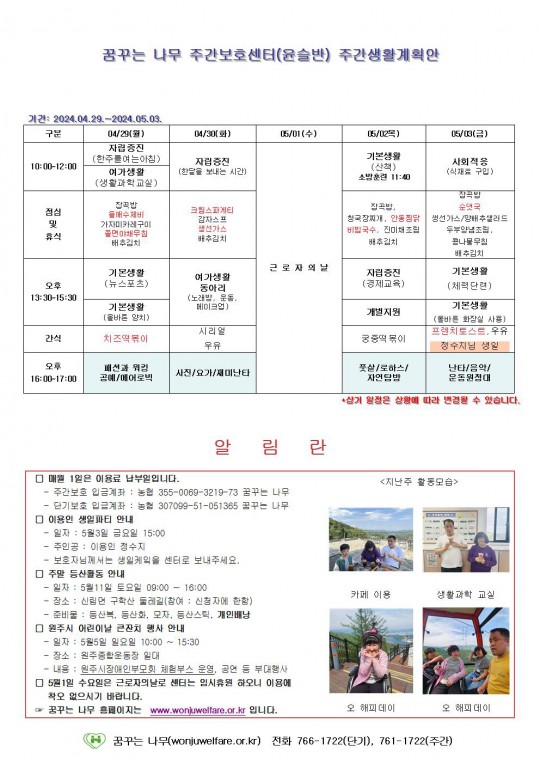 2024.04.29 ~ 2024.05.03 주간보호 주간계획안입니다.